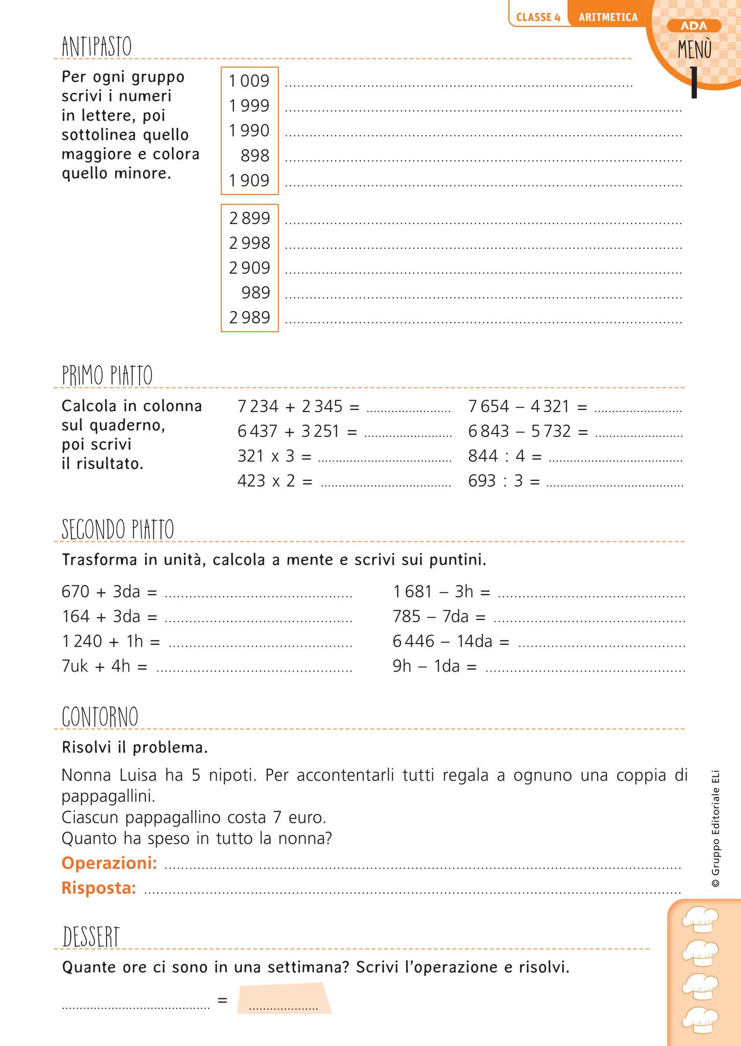 - Le schede sono numerate e strutturate come se fossero dei veri e propri Menù: quattro “portate” (= blocchi di esercizi), dall’antipasto al dessert. Possono quindi essere assegnate integralmente oppure solo in parte.