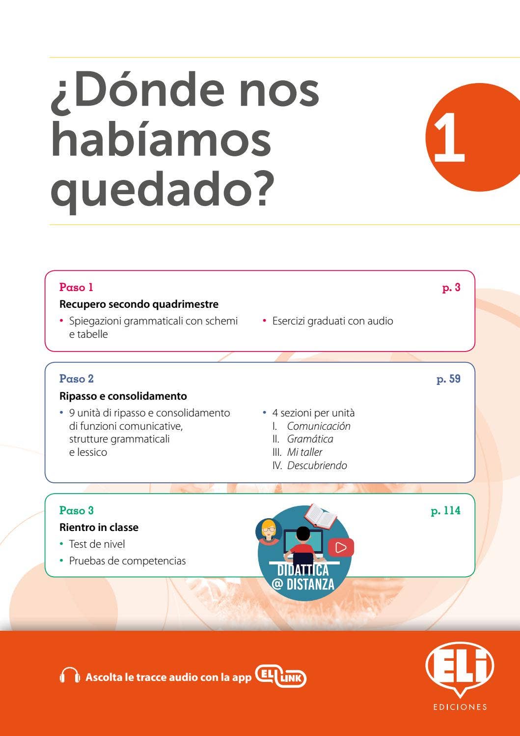 In ¿Dónde nos habíamos quedado? troverai tante lezioni per il ripasso degli argomenti grammaticali di lingua spagnola, da assegnare durante le vacanze, per il recupero in qualsiasi momento dell’anno scolastico o per il rientro in classe a settembre. I testi includono spiegazioni semplici con schemi e tabelle, tante attività graduate e tanti esercizi di ascolto.