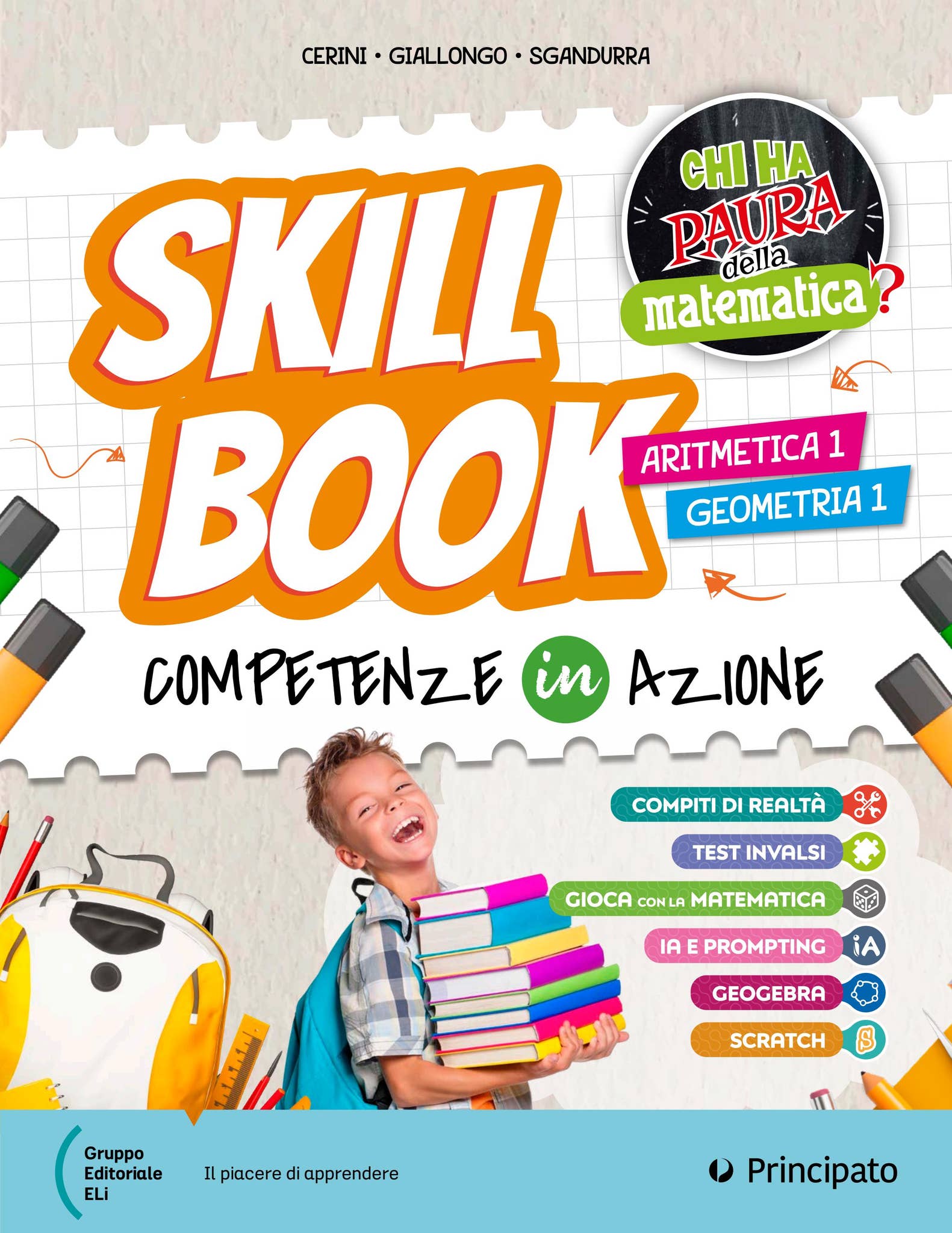Skill Book + Studiafacile: tre volumi capovolgibili: lo Skill Book con attività operative (compiti di realtà, INVALSI, giochi, AI, Scratch, GeoGebra) e lo Studiafacile con mappe e spiegazioni semplificate di tutti gli argomenti.